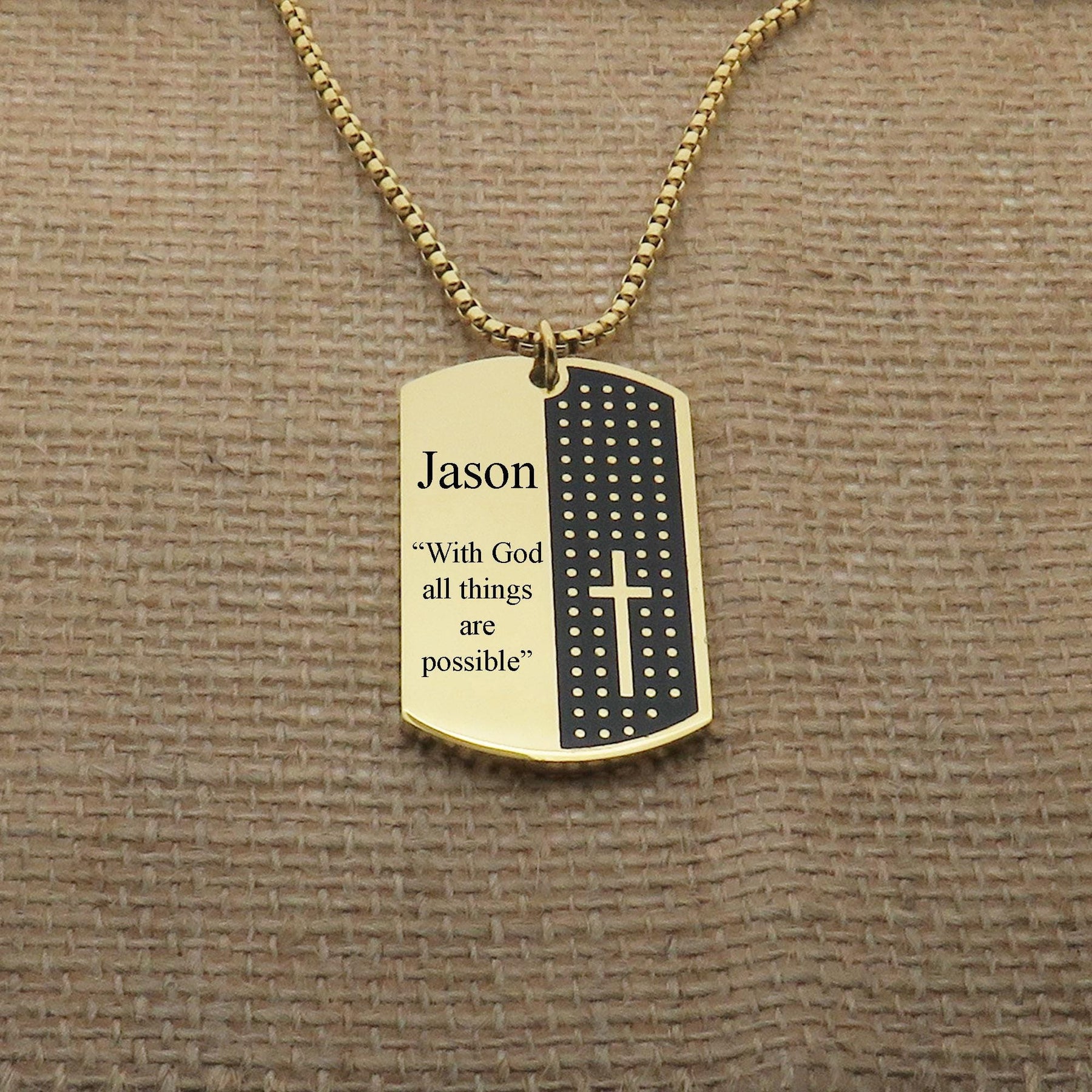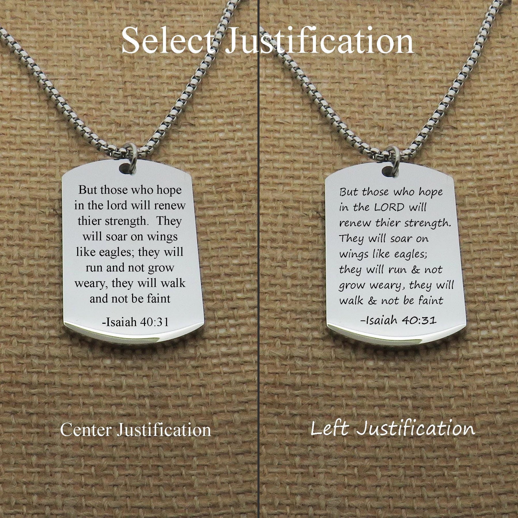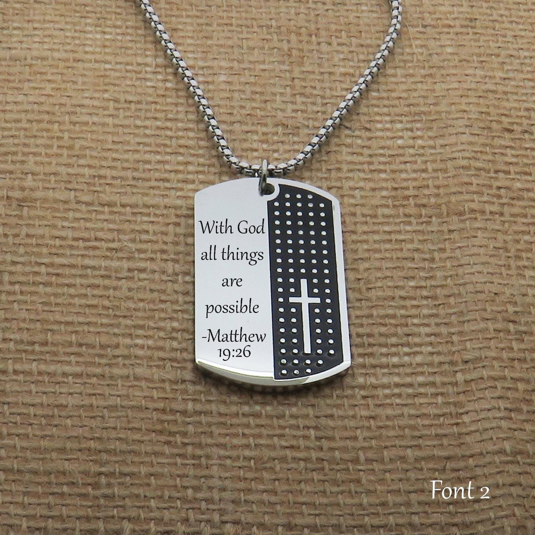 Personalized this dog tag with your favorite Bible verse engraved in the font of your choosing. You can add a personalized message on the back. Give this personalized necklace to your loved one or wear it yourself. Please note: the more letters the smaller the font size will be. Please check your email often in case I have question(s).